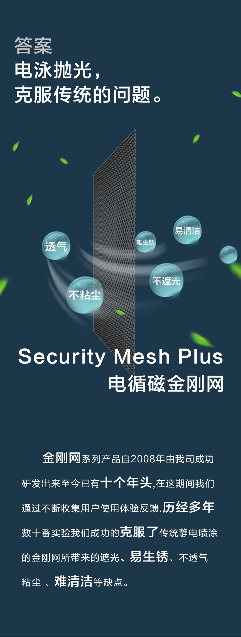 Product Features產品特點:電循磁金剛網采用全新工藝,利用美國PPG Industries的電泳水性漆,對鋼絲進行全方位覆蓋,提供比靜電粉末噴涂更全面的保護,確保絲與絲交織處無一處裸露。電泳涂層不僅保持了產品的通風和采光效果,同時確保網孔方正且均勻,孔徑一致。與傳統工藝相比,產品在抗銹、抗腐蝕能力上有顯著提升,同時解決了靜電粉末噴涂易吸附灰塵難以清潔的問題,光滑涂層提高了清潔效率。該產品還獲得了中國發明專利,填補了市場對高品質差異化產品的需求,尤其適合中高端客戶群體,滿足他們對高品質、無售后問題的期待。