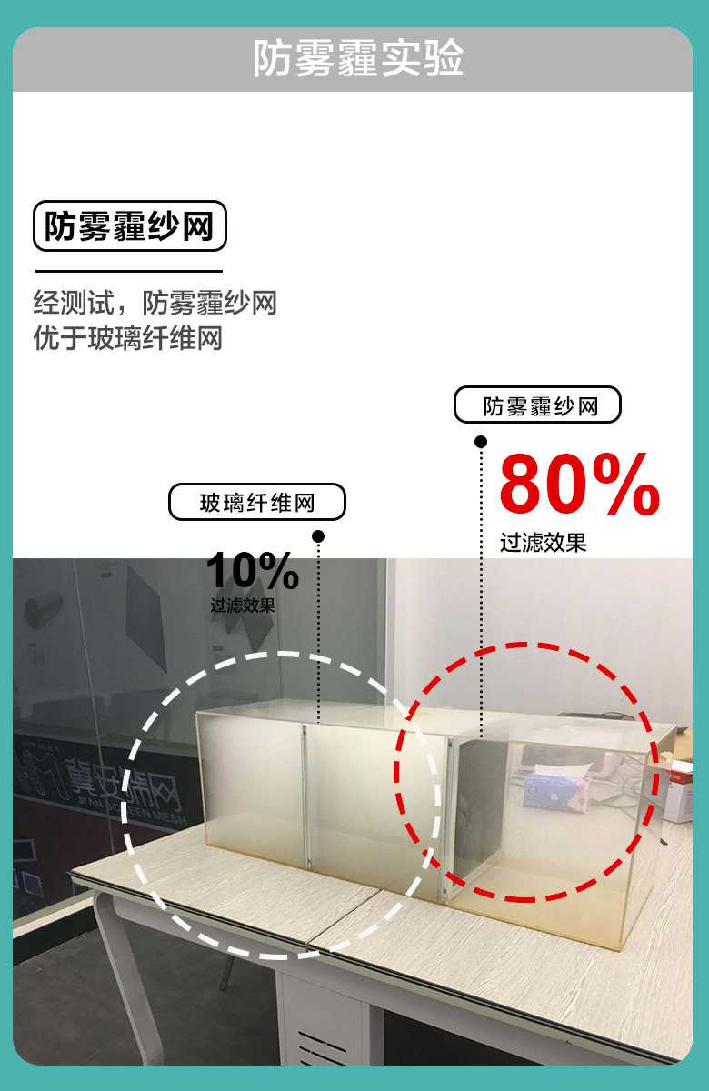 Product Features產品特點:防霧霾紗網采用現代技術,為用戶在霧霾天也能開窗通風提供了解決方案。產品通過表面特殊防水處理來隔絕PM2.5顆粒物,而不是依賴網目密度,從而在保持通風和透光性的同時實現有效防護。由于霧霾顆粒多依附于空氣中的水分,表面處理隔絕水分子,達到了阻隔PM2.5的效果。紗網表面具備荷葉疏水性,大幅提升了清潔的便捷性。