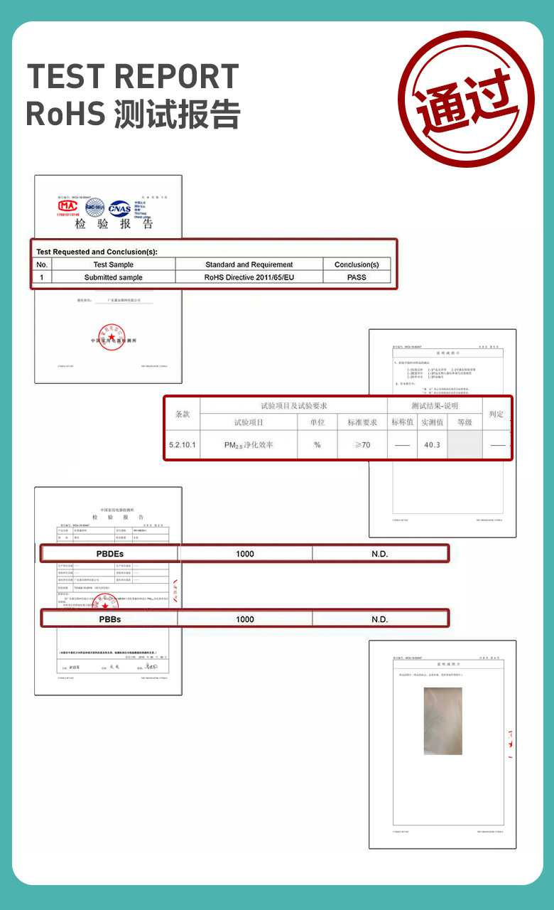 該產品能有效阻隔PM2.5顆粒、沙塵、花粉、柳絮、棉絮及汽車尾氣等污染物,并在測試中展示了其對煙霧等高密度顆粒物的出色隔絕效果。產品通過了ROHS重金屬環保檢測,且保留了22%的通風率和25%的透光性,對紫外線的阻隔率高達96%。