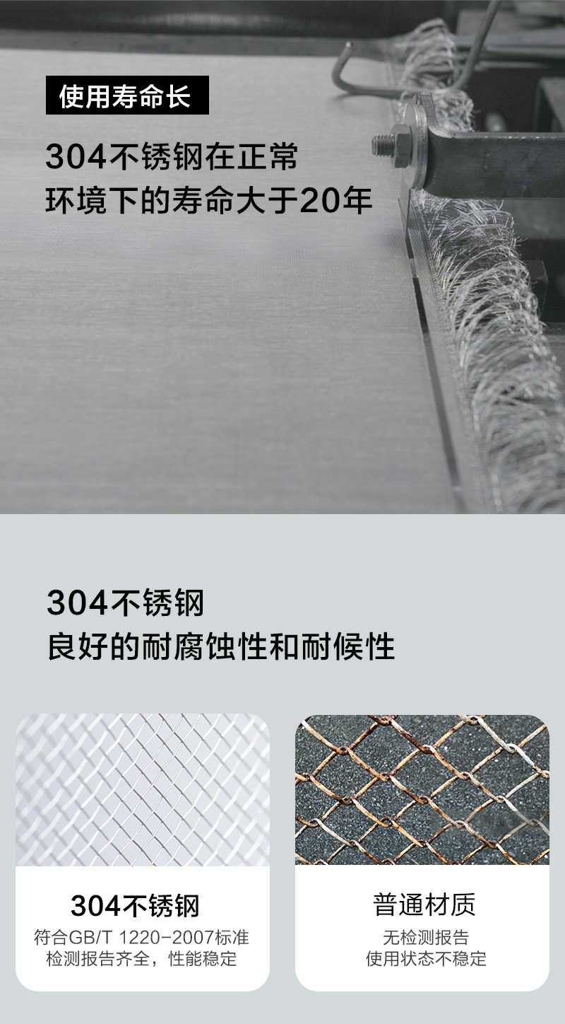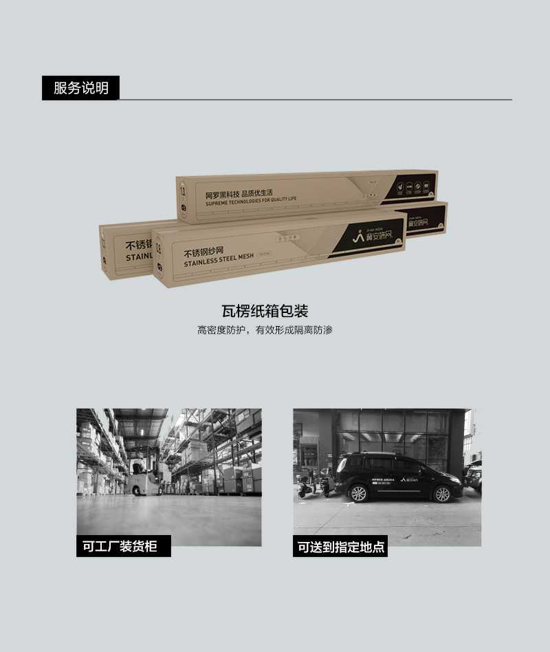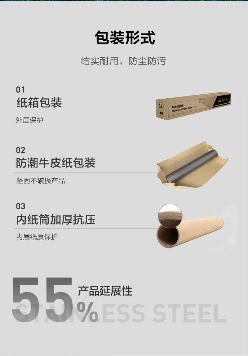 Product Features產(chǎn)品特點(diǎn):不銹鋼窗紗以其卓越的耐用性和多功能性,廣泛應(yīng)用于住宅和工業(yè)領(lǐng)域。這種紗網(wǎng)由高強(qiáng)度不銹鋼線制成,能夠有效抵御惡劣環(huán)境中的腐蝕,在沿海或潮濕地區(qū)也能保持良好狀態(tài)多年不生銹。它非常適合高濕度和沿海環(huán)境,其抗腐蝕性使其即使在極端天氣下也能保持不變形、不易生銹,紗網(wǎng)結(jié)構(gòu)既能阻擋蚊蟲和灰塵,又不會(huì)影響通風(fēng)和自然光的透入,使用戶享受清晰的外部視野,由于其強(qiáng)度高、不易損壞,不銹鋼窗紗不僅適用于防蟲,還能在某些情況下提供額外的安全保障。在家庭中,不銹鋼窗紗常用于窗戶和門的紗窗,以提供防蟲保護(hù),并確保空氣流通。這類窗紗特別適合沿海和潮濕地區(qū)的家庭使用,避免傳統(tǒng)紗網(wǎng)因濕氣而生銹,在工業(yè)領(lǐng)域,不銹鋼紗網(wǎng)廣泛應(yīng)用于通風(fēng)系統(tǒng)、過濾設(shè)備以及倉庫門窗中,用于阻擋灰塵、昆蟲或雜質(zhì)。此外,這種紗網(wǎng)也可用于食品和制藥行業(yè)的篩選和過濾,確保符合高標(biāo)準(zhǔn)的衛(wèi)生要求。不銹鋼窗紗的高強(qiáng)度、耐腐蝕性和優(yōu)異的通風(fēng)性能,使其成為市場上備受青睞的選擇。無論是在住宅還是工業(yè)應(yīng)用中,不銹鋼窗紗都提供了高效、可靠的解決方案,滿足了不同場景下的使用需求。