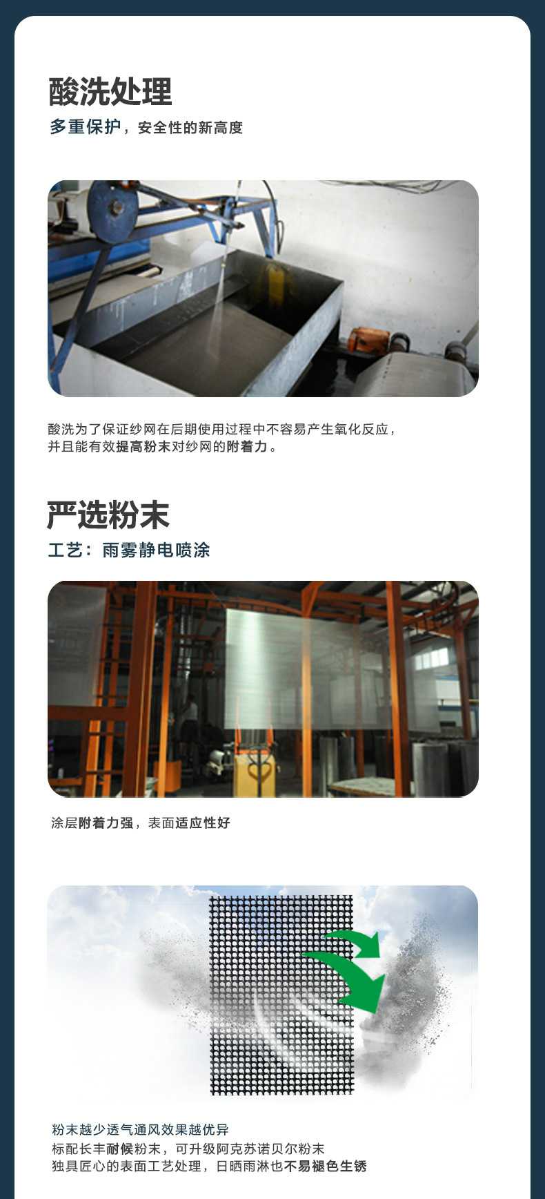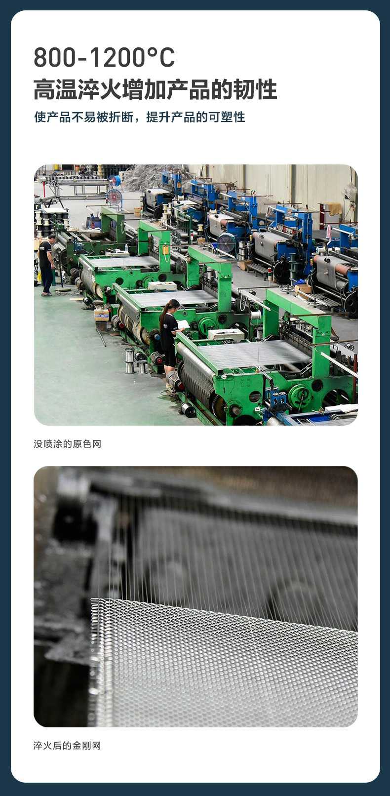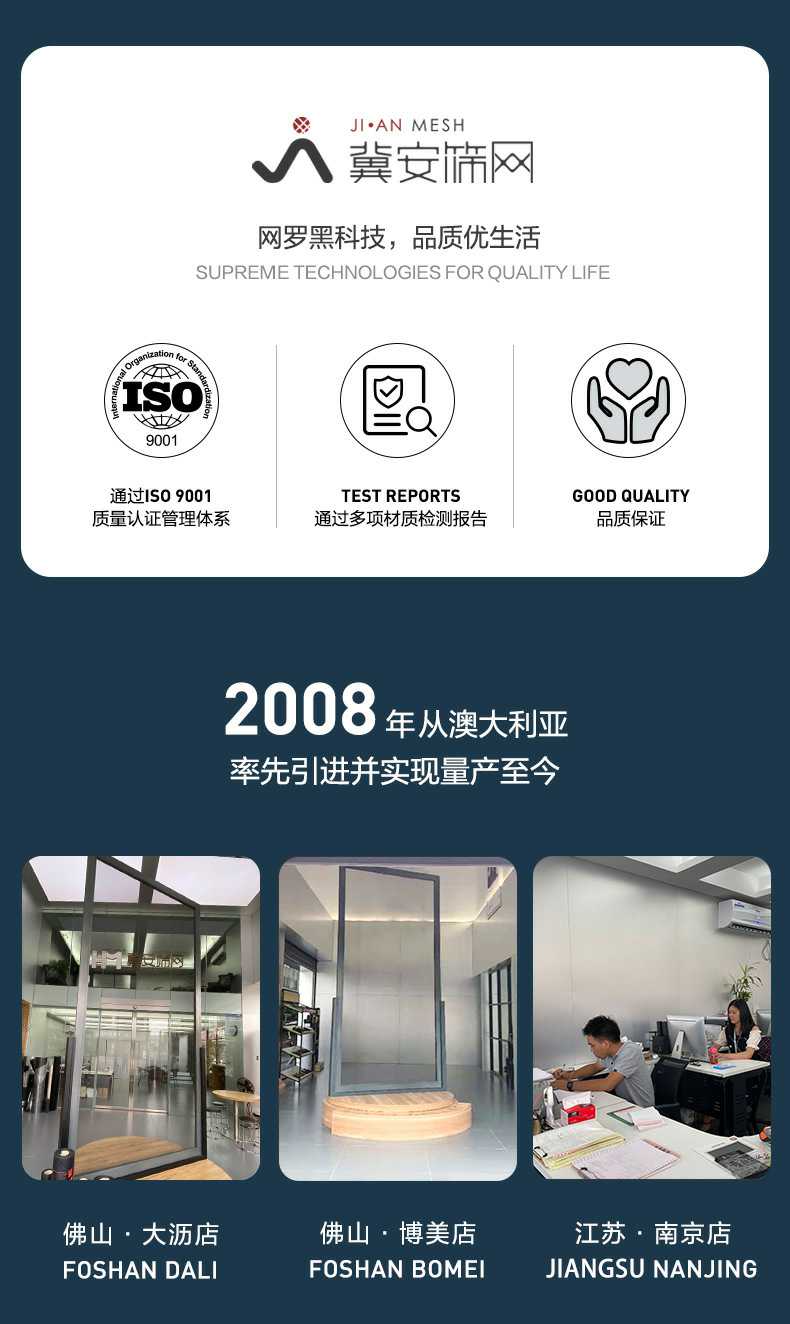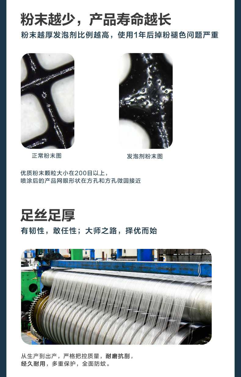 Product Features產(chǎn)品特點:金剛網(wǎng)自2008年在中國大規(guī)模生產(chǎn)和銷售,至今已有15年以上的生產(chǎn)經(jīng)驗,確保了產(chǎn)品的質(zhì)量與出廠品質(zhì)。該產(chǎn)品采用靜電粉末噴涂工藝,有效包裹絲徑,提升抗腐蝕能力,但需控制粉末厚度,過厚的粉末會使網(wǎng)孔呈圓形,影響透光率和通風(fēng)效果。產(chǎn)品的線徑越粗,防護性能越好,但網(wǎng)孔也會相應(yīng)變大,防蚊效果略有下降。為達到理想的防護效果,線徑需在0.8mm以上,線徑過細(xì)則防護性能不佳。
