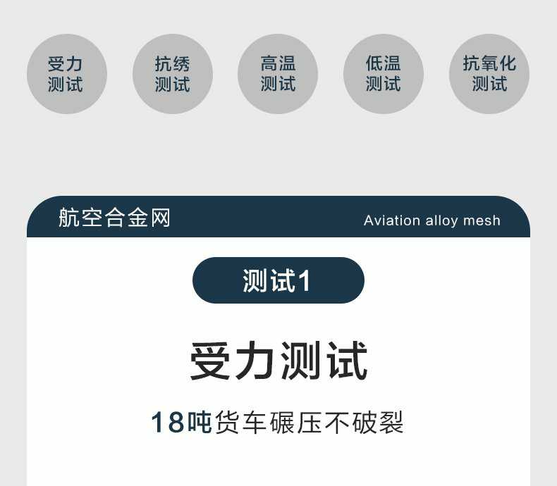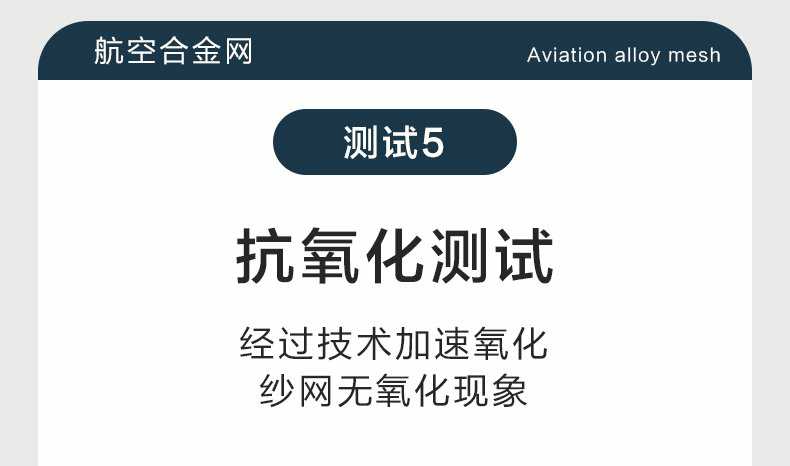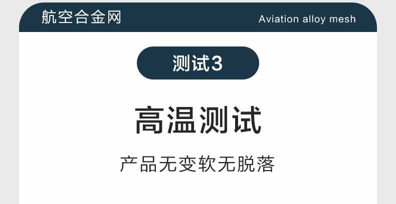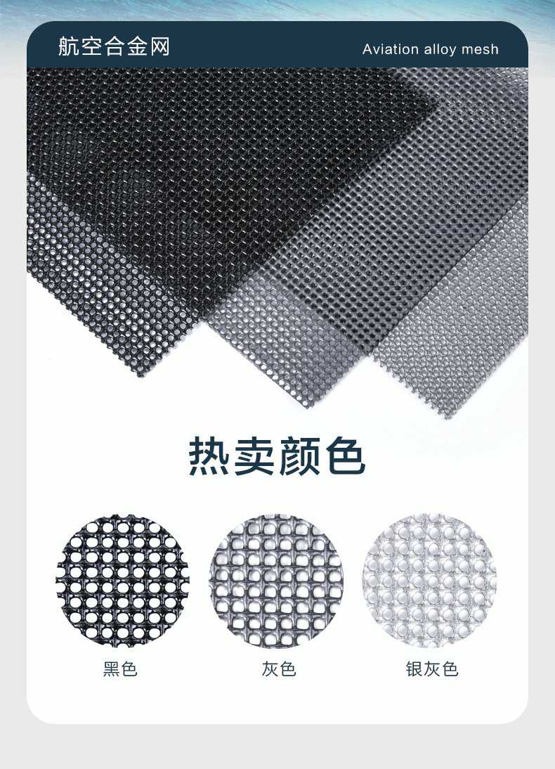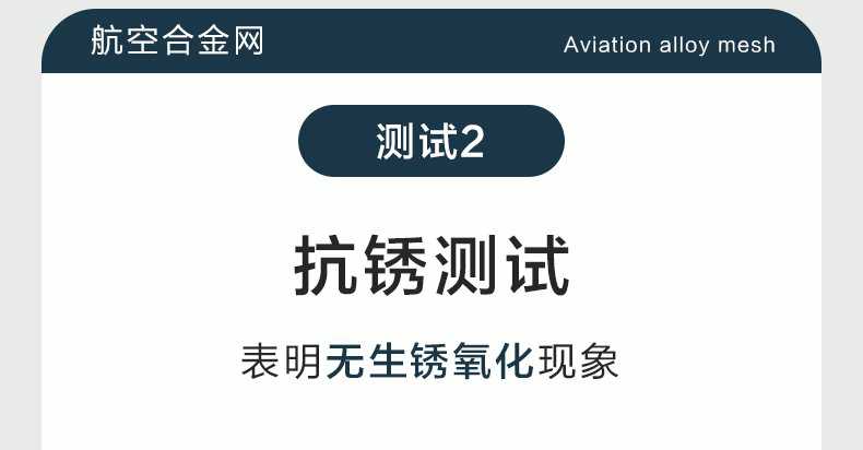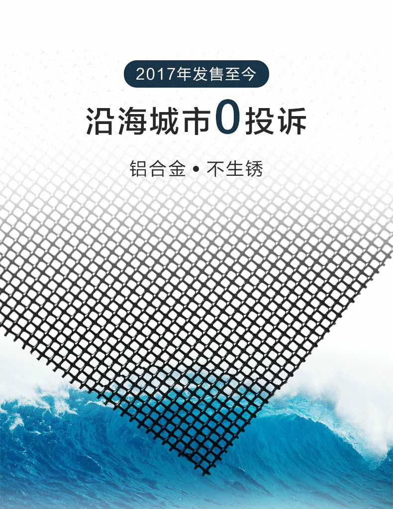Product Features產品特點:航空合金網自2017年發售以來,表現出極高的穩定性,至今未有生銹或氧化的投訴,非常適用于沿海城市,其突出的抗腐蝕性能備受好評。盡管鋁合金的韌性和強度不及304不銹鋼,但其與型材接觸不會產生電化學反應,而304材料則可能加速鋁型材的氧化或自身生銹。雖然鋁合金的抗拉強度僅為304不銹鋼的四分之一,但仍支持使用螺絲固定,且使用壽命不受影響。首批訂單已近10年,產品未出現老化或破損,僅粉末有輕微褪色,不影響防護功能。該產品通過了高溫和低溫測試,能在60℃的高溫環境中長期使用且結構穩定,在-25℃的低溫下也不會斷裂。